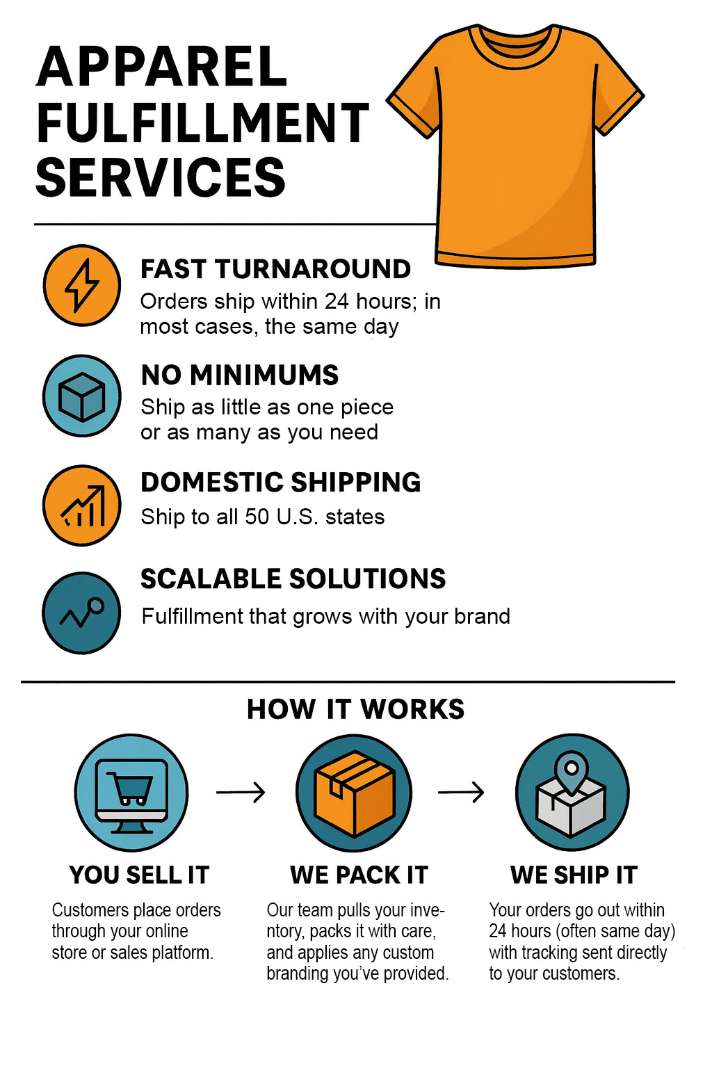 From screen printed tees to hoodies, hats, and merch bundles, we know apparel. Our fulfillment process is designed specifically to handle the unique needs of clothing; folded perfectly, protected in transit, and presented professionally upon arrival.